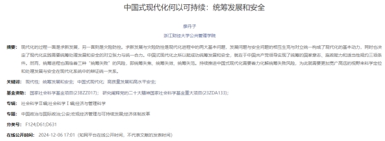 论文题目:中国式现代化何以可持续:统筹发展和安全