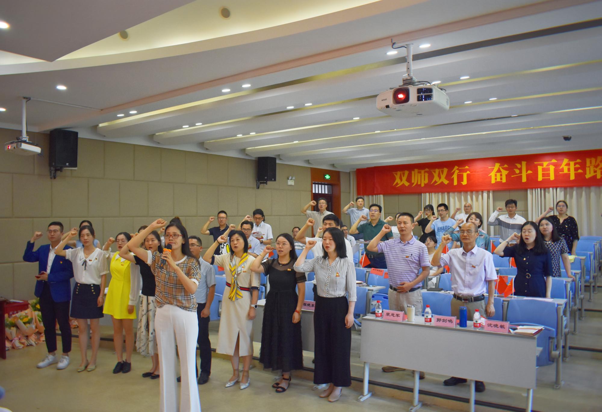 党委书记沈晓敏带领全体教工党员面向党旗,高举右手,庄严宣誓,表达了全体教职工不忘初心、牢记使命,为党的事业不懈奋斗的信念和决心。
