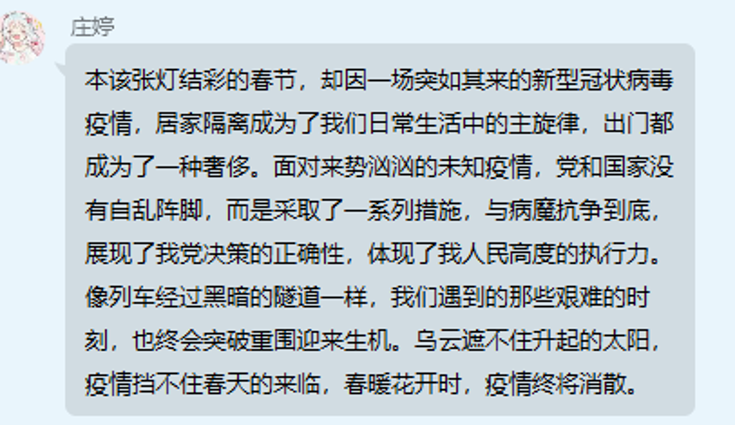活动开始,杨老师问候党员同志们的寒假生活情况,关心党员同志们的身体健康与学习情况。随后,杨老师播放了《口罩专机》、《我是党员,我先上》、《作为党员首先就应该站出来》等视频。在这场没有硝烟的战“疫”中,发生了很多感动的故事,逆行者白衣天使、志愿者城市摆渡人、村口接力防护者,还有一幕感动的场面就是“口罩专机”。柬埔寨华人华侨、肯尼亚华人华侨,当听到国内口罩短缺、防护服吃紧、医护物资告急的消息,当听到炎黄子孙的同胞们需要帮助时,他们跨国包机,驰援战“疫”。飞机上不仅仅是口罩,更是他们的赤子之心,爱我中华,家是中国!我是党员,我先上!一句简简单单的话语,但是充满了斩钉截铁的果断和勇往直前的担当。