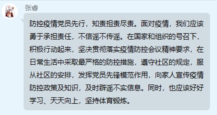 活动接近尾声,杨文超老师分享了自己观看视频后的感受,对第一党支部的党员同志们踊跃捐款,参加志愿活动表示鼓励与赞赏,并叮嘱参与志愿活动的党员同志务必注意安全。最后,老师鼓励大家在寒假期间安心呆在家中学习,坚持锻炼,增长身体素质,为抗击疫情贡献一份力量。
