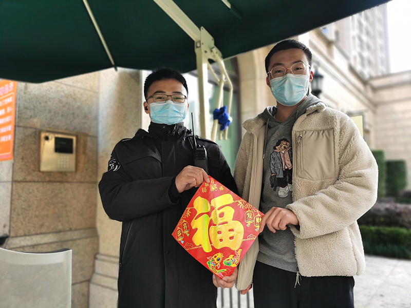 的几位杭州籍学生党员感动于“就地过年人”的付出与奉献,也想为他们做点什么,便自发购买福字为他们送“福”送温暖,感谢他们为助力疫情防控所做出的贡献。