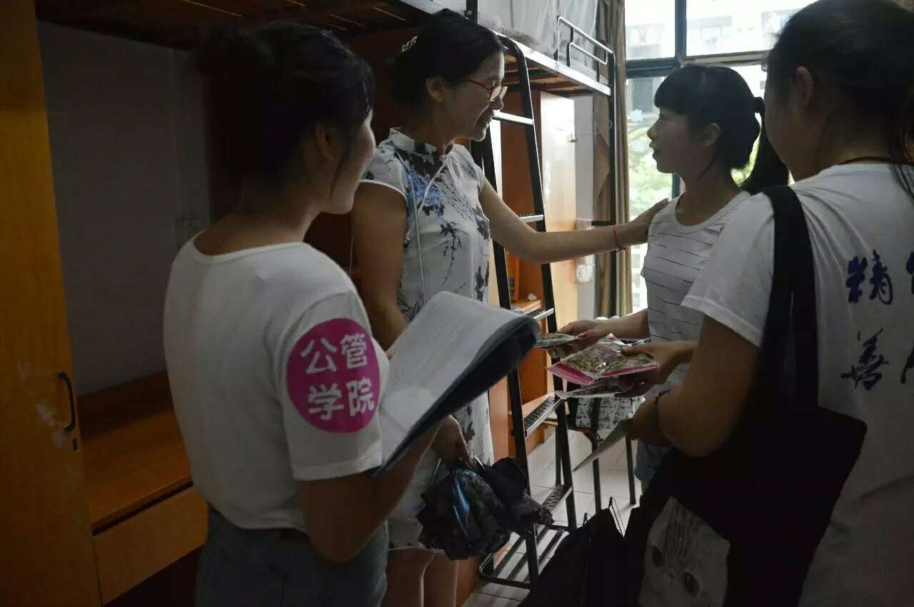 领导班子成员分为四个小组,在辅导员的陪同下来到2016级新生所在的1幢、12幢和15幢宿舍楼,分别进行走访活动。