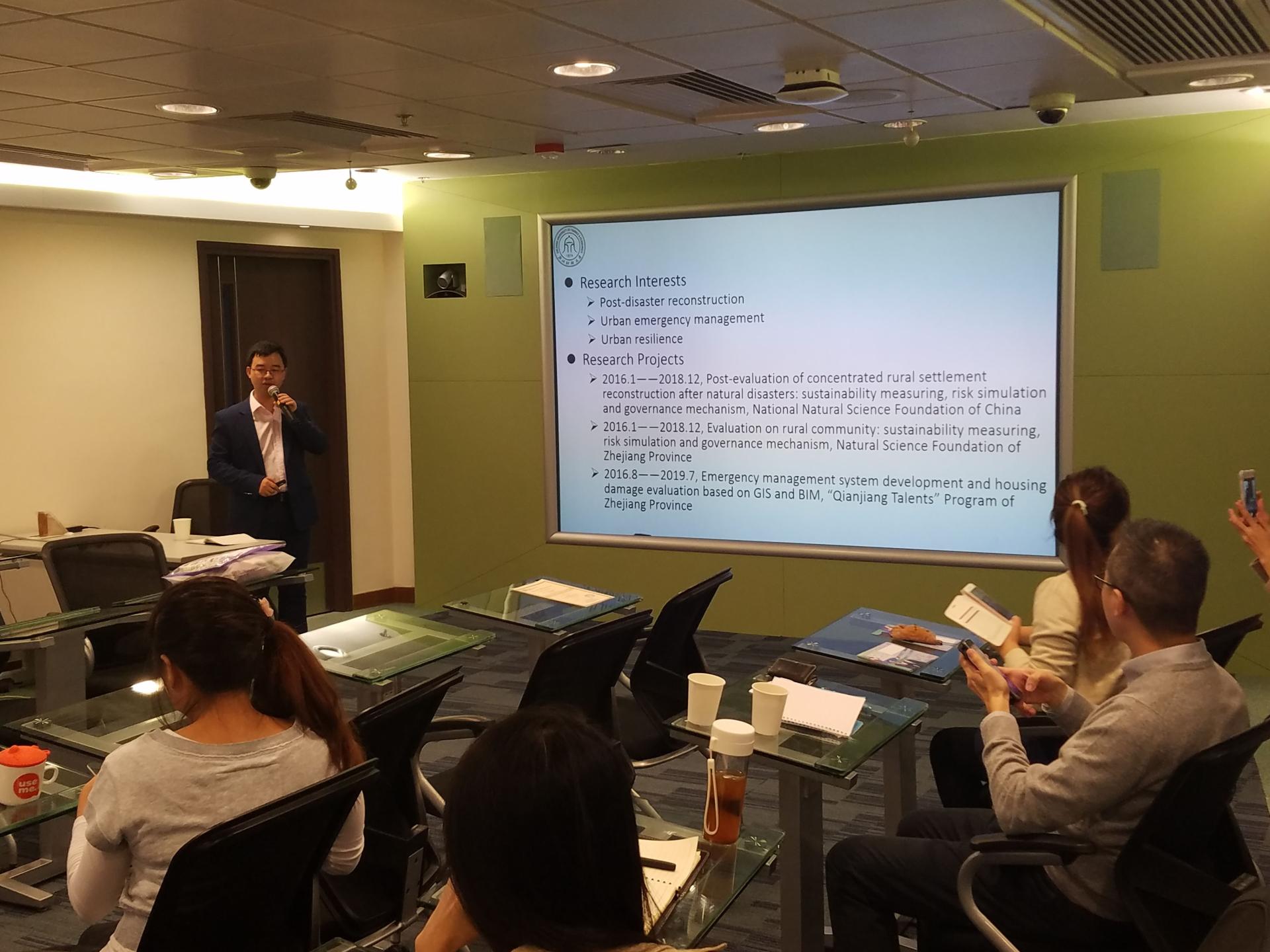 工程管理系老师彭毅,受邀在香港理工大学建设及房地产学系访问,并作了题为 “What are learnt in concentrated rural settlement development after the 5.12 Sichuan Earthquake: Implications from both big and small data”的学术报告。彭毅老师结合国家自然科学基金资助课题的研究,分享了综合应用文本挖掘与问卷调查进行灾后重建研究的发现与心得体会。报告获得了师生们的一致认可,并进一步就文本挖掘、政府与社会在灾后重建中的角色等问题进行了热烈地讨论。