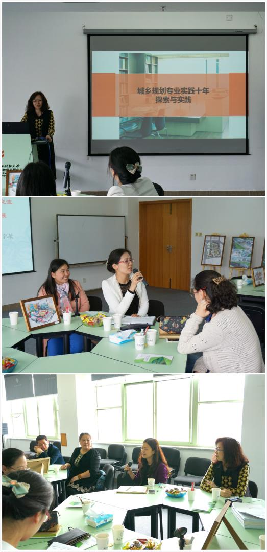 魏遐老师做了题为《城乡规划专业实践十年探索与实践》的主题报告,讲述了从最早师生几人组织的太湖临湖考察到确认太湖一条线的专业实践基地,以及之后逐渐确认的世界非物质文化遗产京杭大运河、西溪国家湿地公园实践基地的艰辛历程。汪凝和郭敏老师分别就自己教授的课程谈了美术课堂教学中“自信课堂”模式的建立和城乡规划专业设计能力培养。三位老师由浅入深,与其他老师及同学们分享了自己的教学经验。祁黄雄老师也做了简单而深刻的发言。