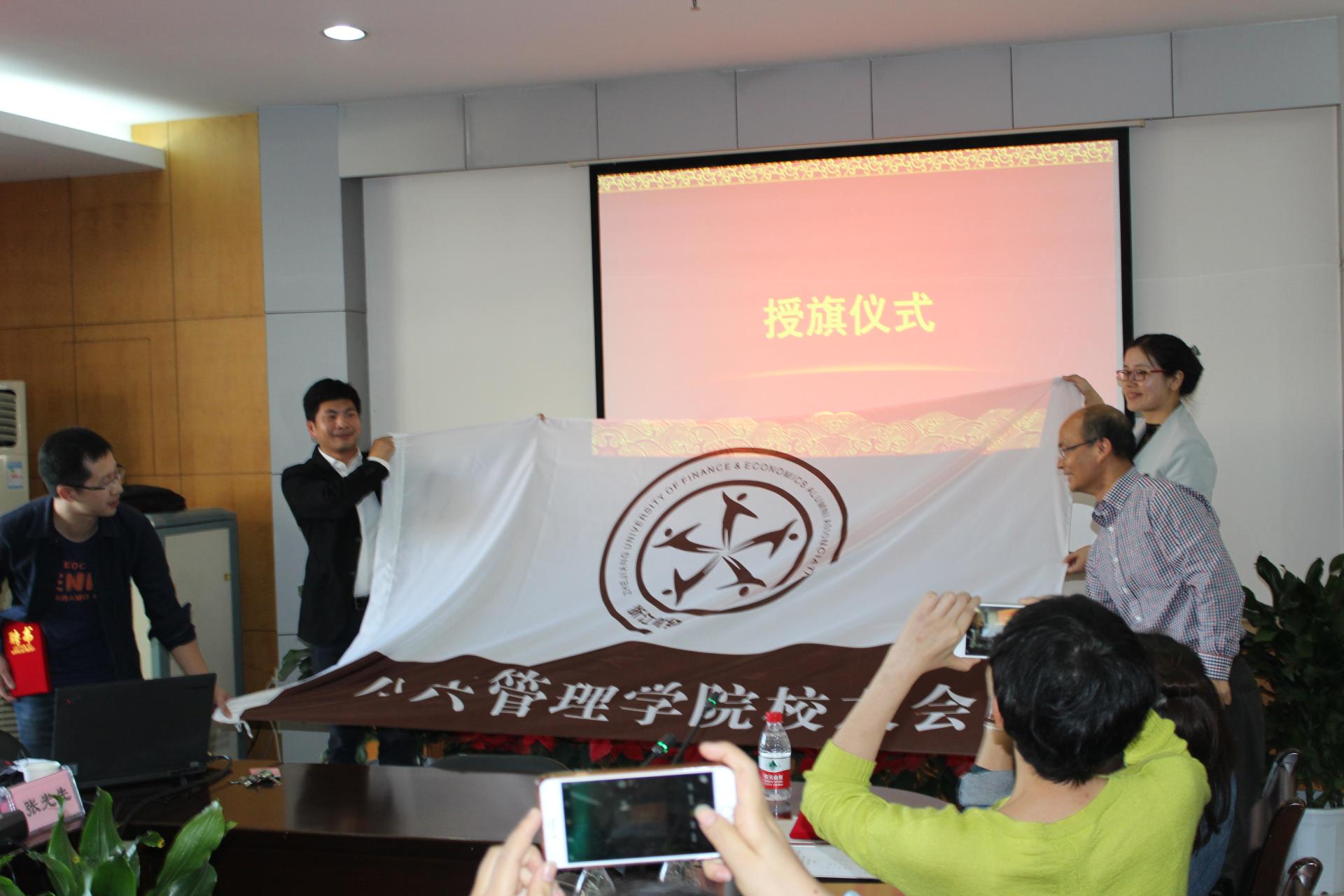 领导郭剑鸣、沈晓敏分别为校友会会长、副会长颁发聘书,并共同为会长授旗。bbin