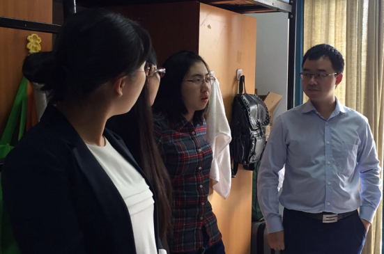 楼,在16级工程管理班班长卢开以及团支书张凌薇的带领下,走访了新生所在的桃李苑1幢和15幢宿舍楼。