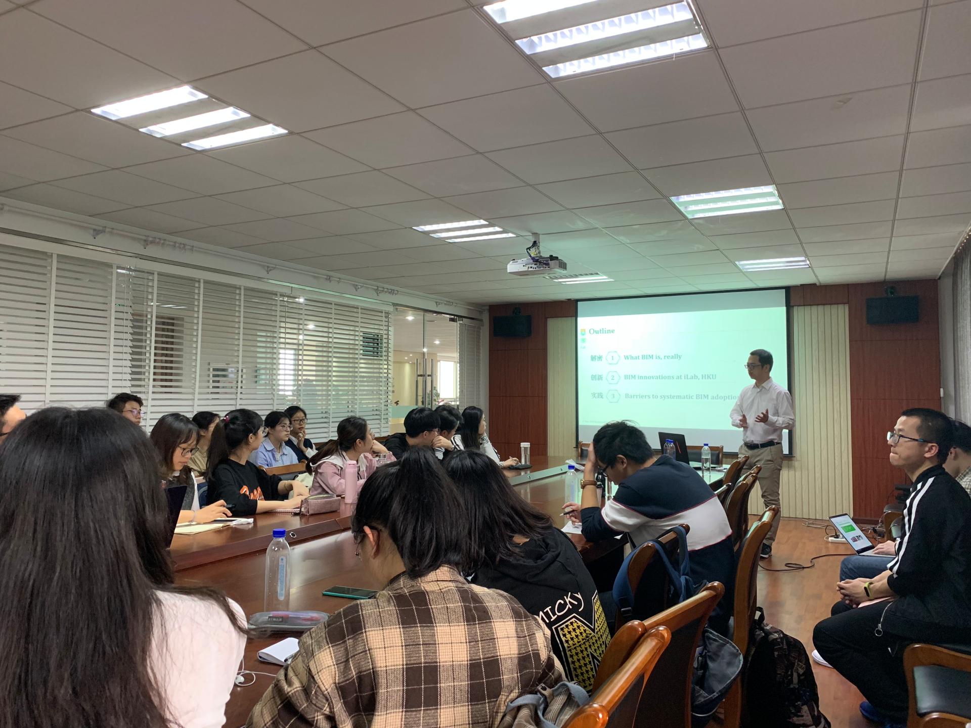 BIM工作坊交流,为师生们作了题为“Demystifying BIM & Innovation”的学术报告。