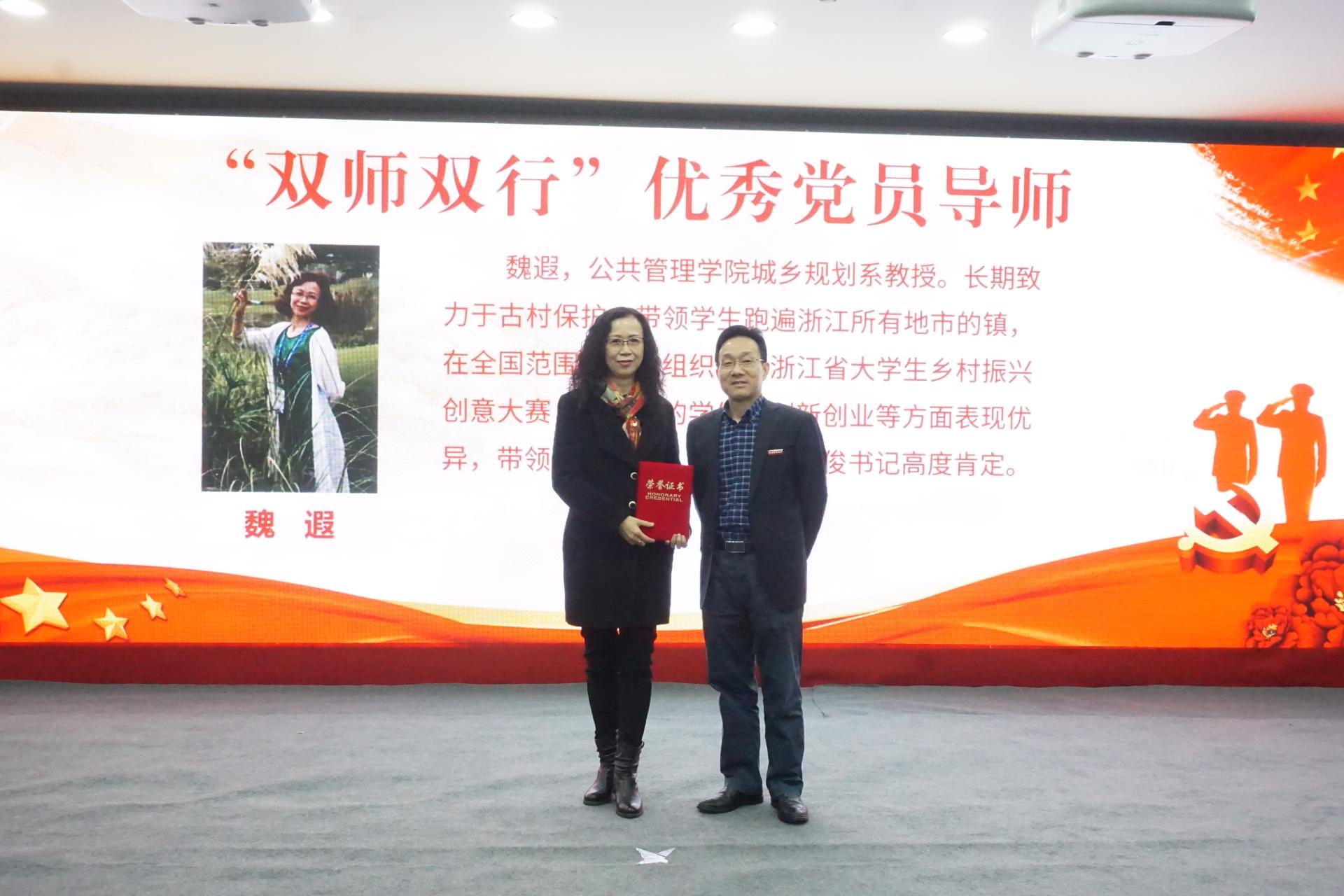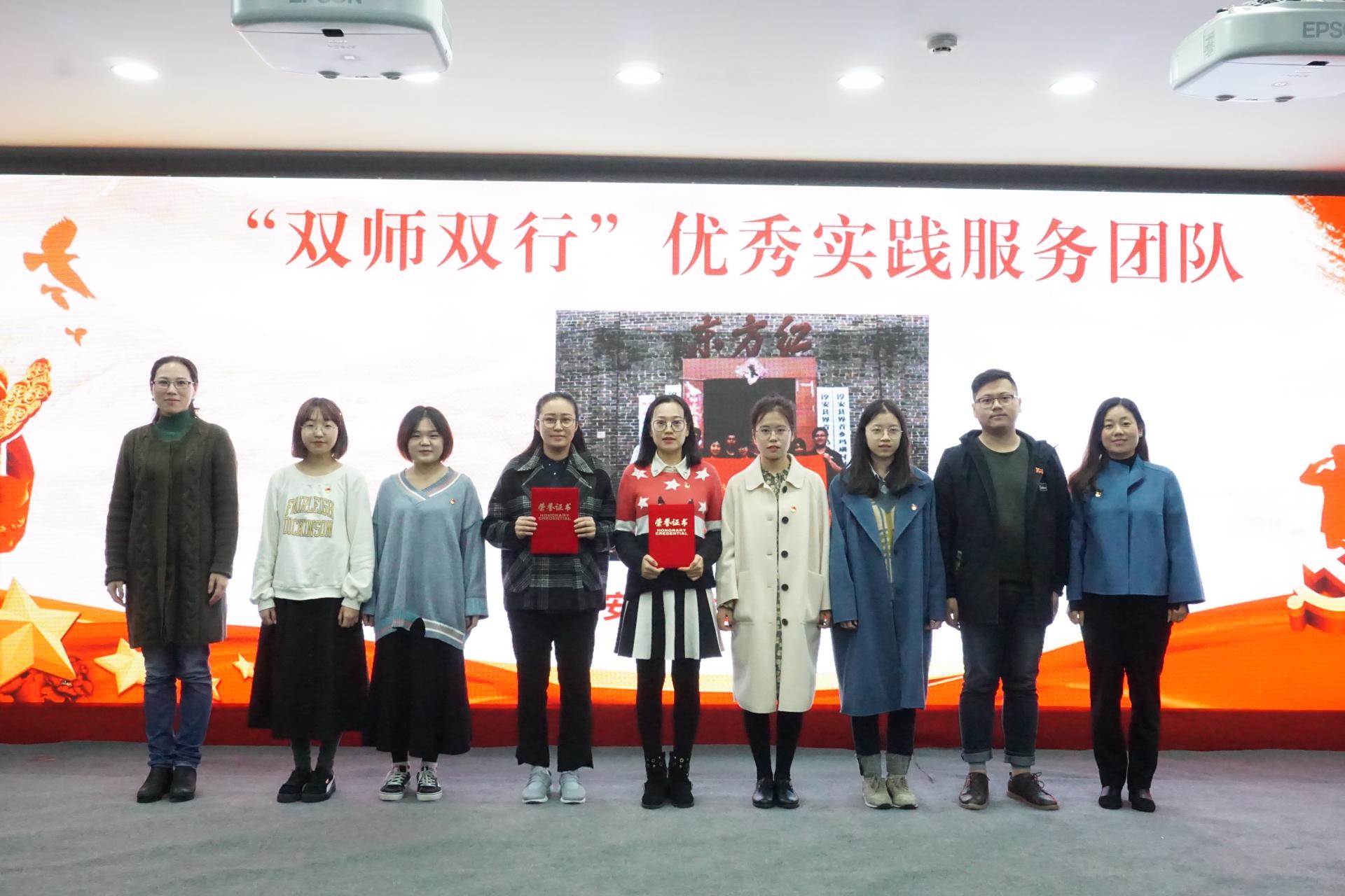 “双师双行”党建育人基本情况,表彰了优秀党员导师魏遐、彭毅,优秀朋辈导师陈俊宇、胡文涛、娄云子,优秀实践服务团队“淳安支教”团队。与会领导分别为优秀个人和团队颁奖,并共同上台揭晓最新的“双师双行”实践服务基地分布图。