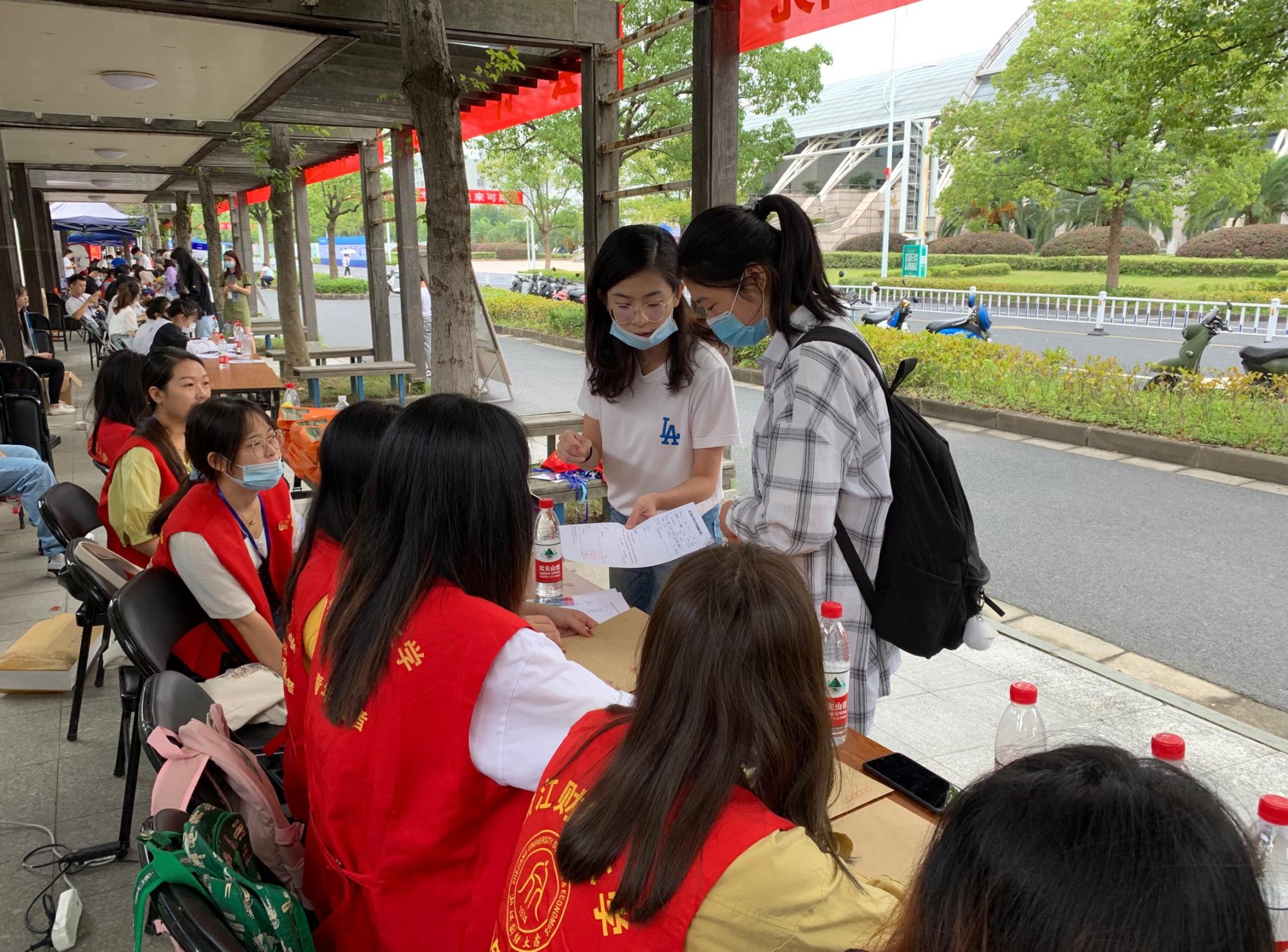 老师组成,制定了全面的迎新方案,组织志愿者提前熟悉整个迎新流程。本次迎新工作分为信息录入组、资料收集组、资料审核组、引导组、咨询组、搬运组等,每一环节都有专人负责。当天一早,志愿者们身穿“红马甲”、佩戴工作证早早来到文化长廊迎新接待处,在卢怡、郭玉飞老师的带领下有条不紊地开展工作,热情招待每一位新同学。