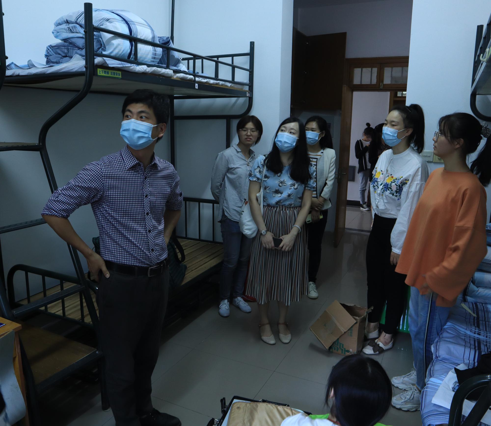 领导在班主任、辅导员的陪同下走进了2020级新生寝室,与新生深入交流,询问家庭情况,畅谈大学计划,并叮嘱各位新生疫情期间要注意做好个人防护,尽快投入到大学的学习生活中。