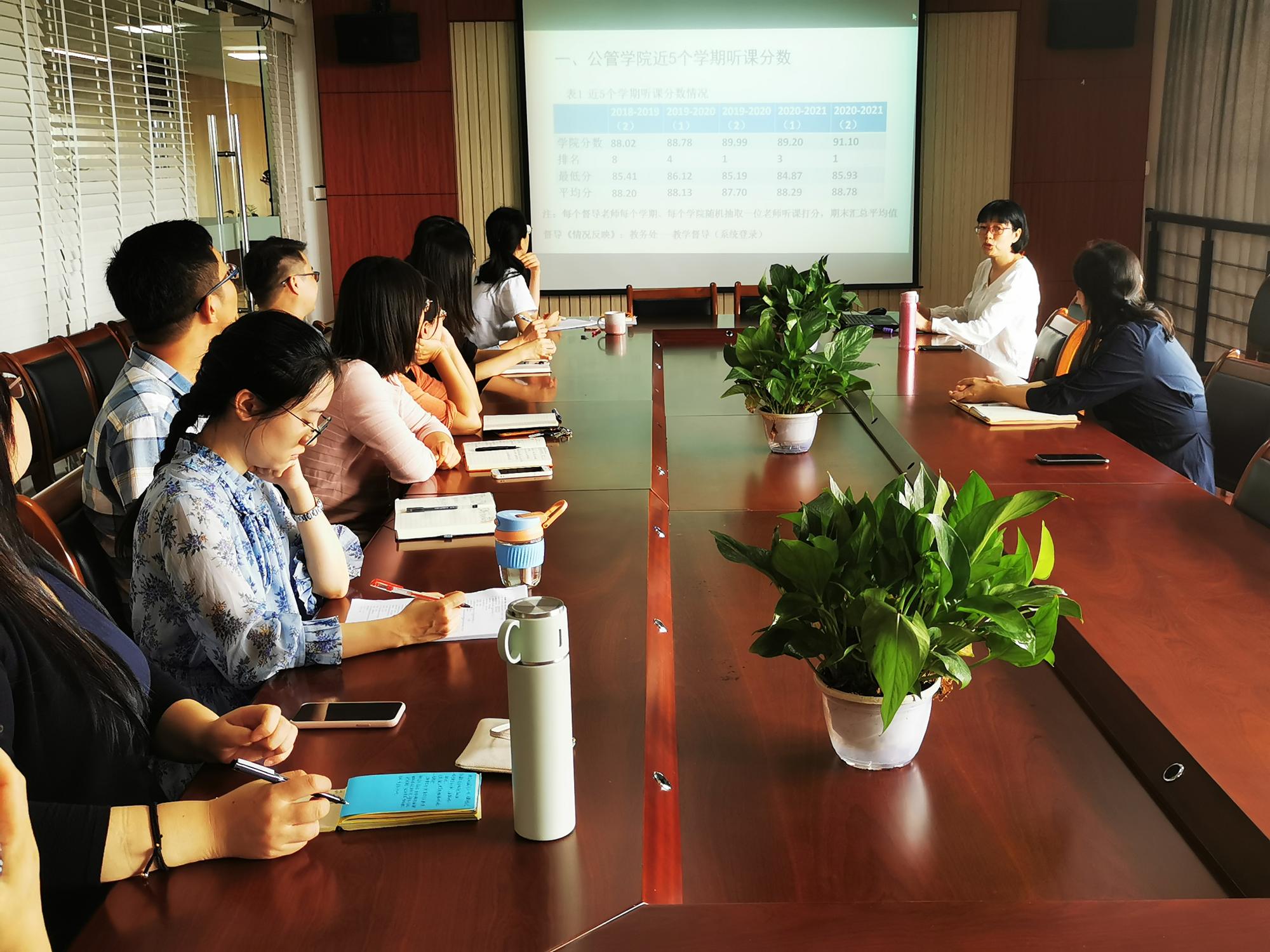 近3年在课堂教学效果上的取得的进步:2020-2021学年第二学期学生到课率和课堂教学检查全校排名第一,并从教学准备、教学内容、教学态度、教学方法及手段等5个方面认真解读了学校督导委课堂教学评价考核内容,最后向老师们详细介绍了如何上好一门课的经验,会议中就如何更好提升青年教师的教学水平进行深入交流。