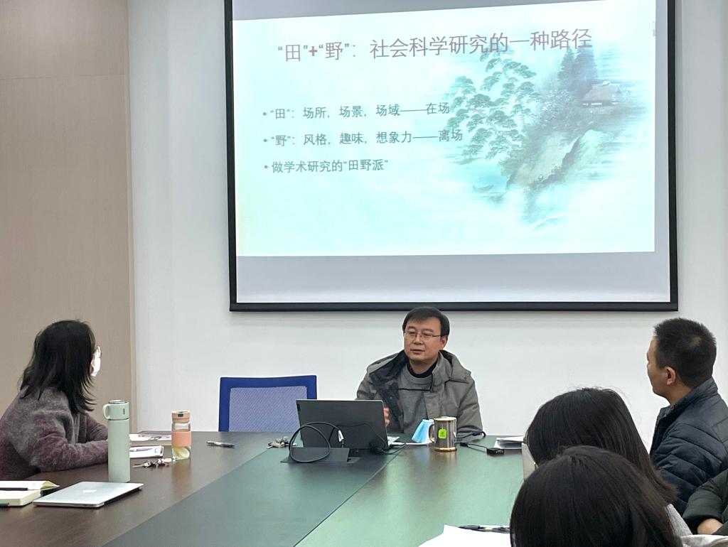 杨雪锋教授首先介绍了自己的学术与科研经历,他认为田野调查应该分为田和野两个部分。“田”是一个在场的概念,不止是简单的场所。“野”是一个离场的概念,是指风格、趣味和想象力,要求研究者选择让人感兴趣的问题进行研究。所谓田野调查的重点,便是要深入其中同时也要超出其外。然后,杨雪锋教授通过对比课题与论文,来讲解课题设计的要点。最后,杨雪锋教授建议在课题选题时既要研究真问题,也要研究好问题。在具体和抽象之间不断转换,把日常现象转换为学术问题,寻找理论和事实之间不吻合的地方。