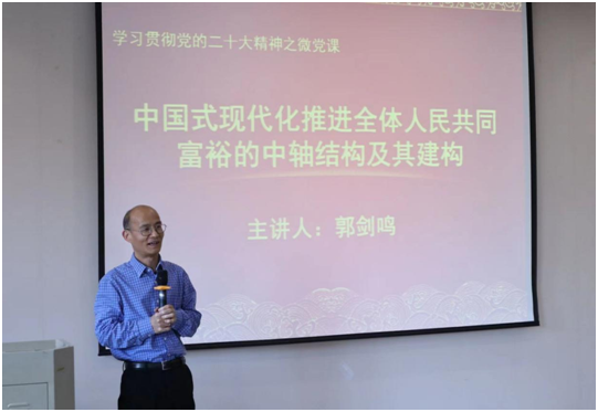 为进一步学习贯彻党的二十大精神,郭剑鸣院长给现场师生作了题为“中国式现代化推进全体人民共同富裕的中轴结构及其建构”的专题党课,深入阐释了中轴结构,并指出万众创新是共同富裕的不竭动力。