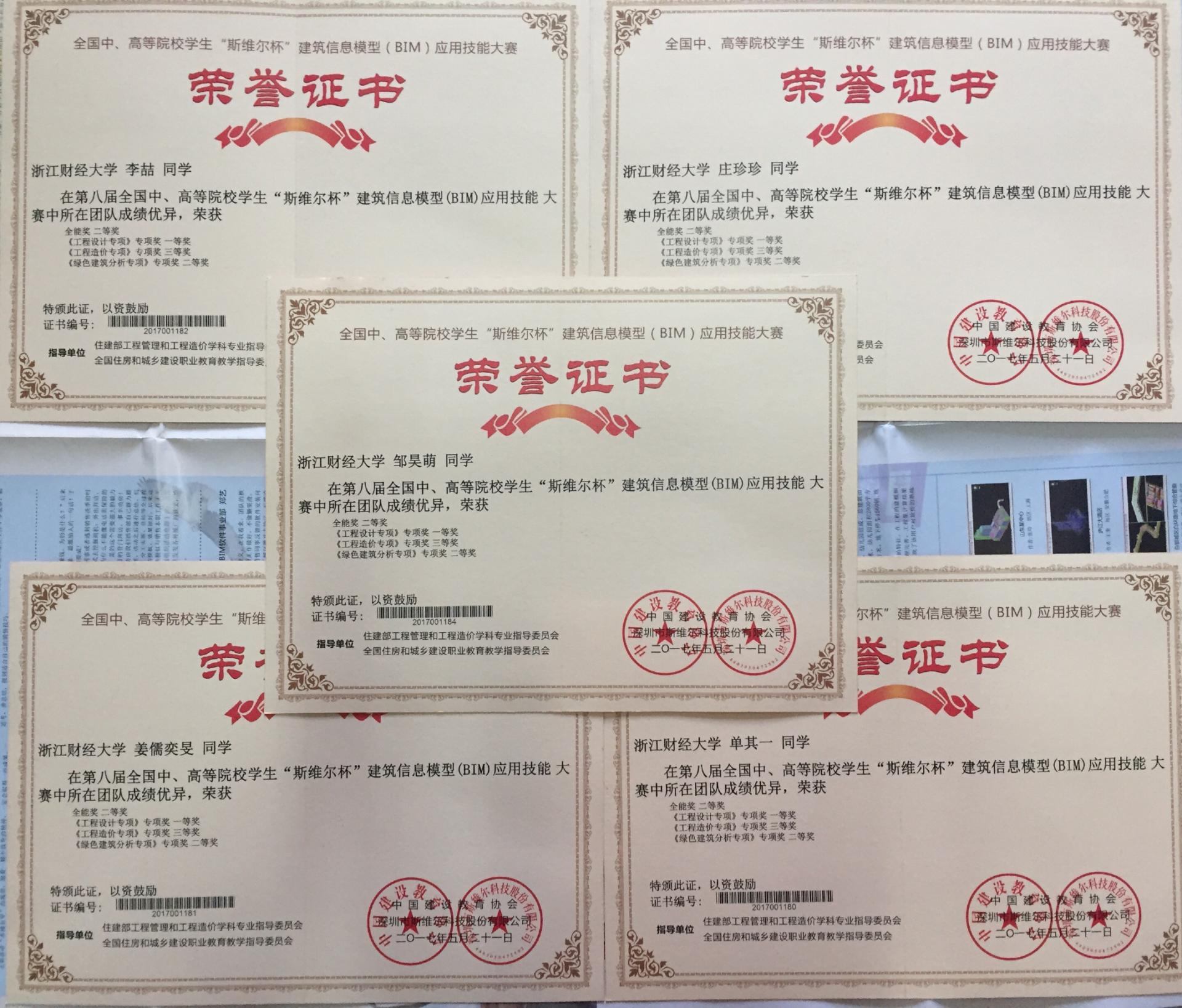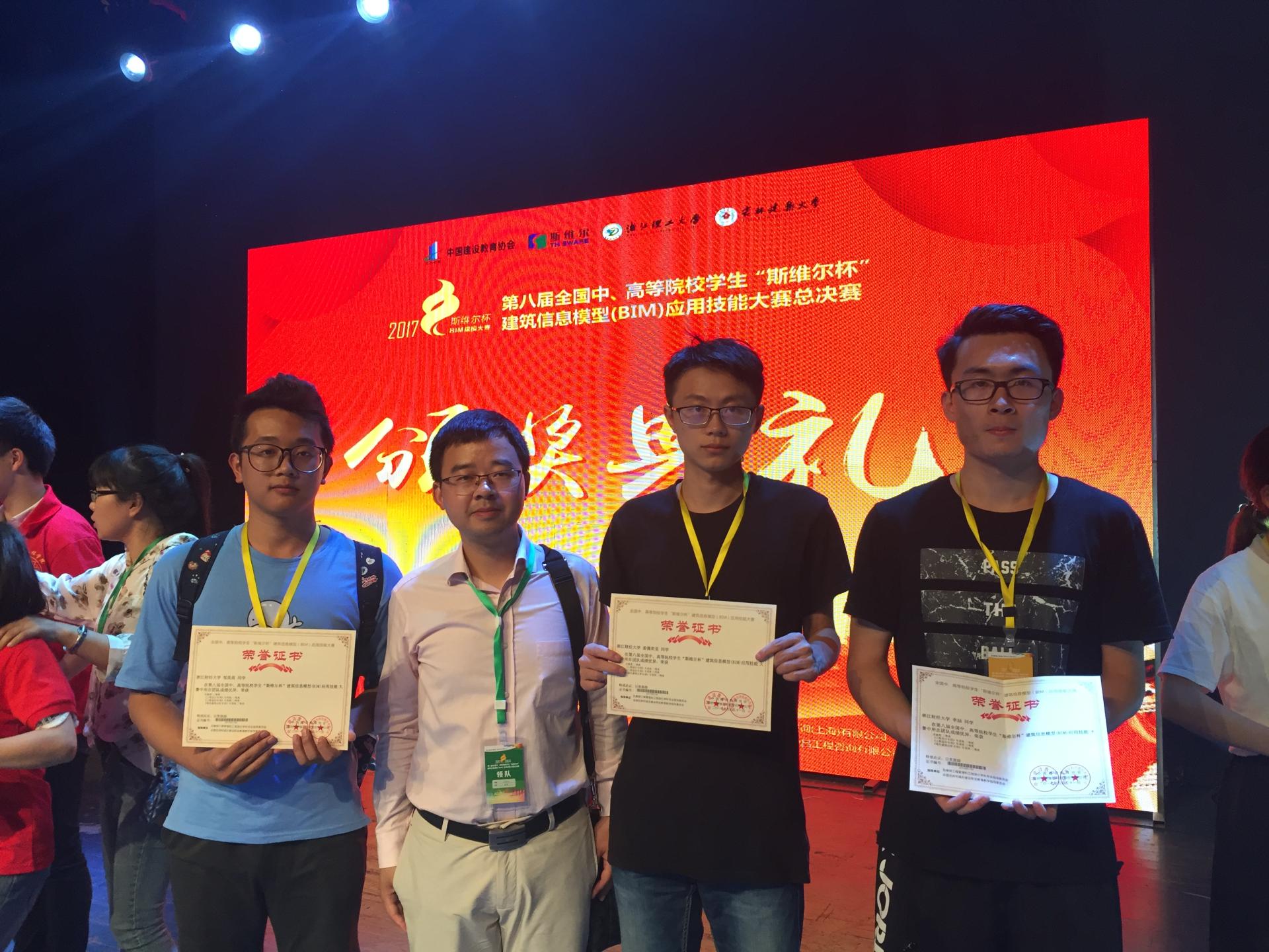 14级工程管理专业邹昊萌、姜儒奕旻和15级工程管理专业李喆、庄珍珍、单其一同学组队参加了第八届全国中、高等院校学生“斯维尔杯”建筑信息模型(BIM)应用技能大赛决赛。来自浙江大学、重庆大学、四川大学等327所本科院校、126所高职院校,共457支代表队,近2300人参赛。经过一整天的激烈角逐,最终荣获全能奖二等奖、工程设计专项一等奖、绿色建筑分析专项二等奖和工程造价专项三等奖。该比赛由工程管理系彭毅老师作为指导教师和带队教师。