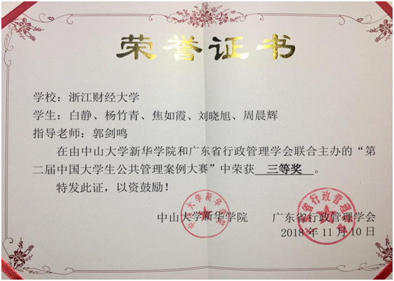 ,指导老师:郭剑鸣,负责人:白静)在比赛期间发挥出色,团队充分展示调研成果,对相关案例问题进行了认真细致的分析,赢得了众多评委老师的认可,最终获得“三等奖”奖项。